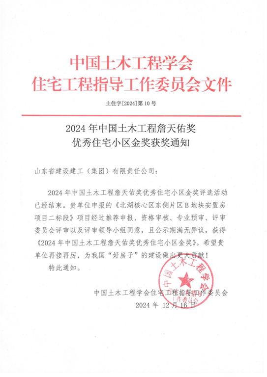 2024年12月,由山東建工集團承建的北湖核心區(qū)東側(cè)片區(qū)B地塊安置房項目二標段獲得中國土木工程詹天佑獎優(yōu)秀住宅小區(qū)金獎。今年全國共48個工程獲獎,集團榜上有名。